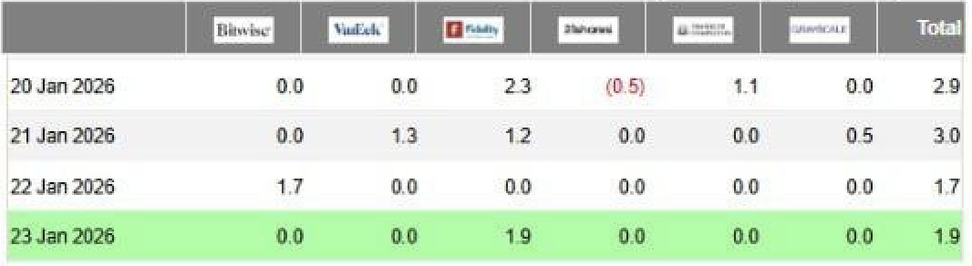 在此背景下,Solana ETF的表现尤为突出。虽然绝对数值不大,但其在报告期内每个交易日均实现资金净流入:1月20日流入290万美元,1月21日流入300万美元,1月22日流入170万美元,1月23日流入190万美元。值得关注的是,该时段内未出现单日资金净流出的情况。