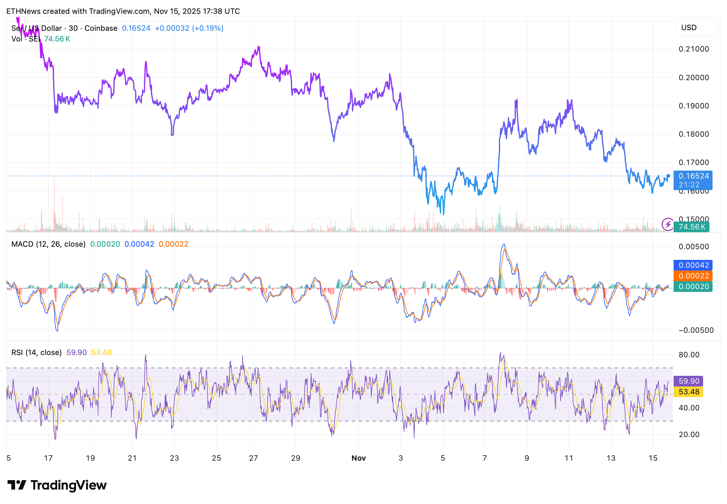 过去数日SEI在0.16至0.17美元区间窄幅震荡,消化月初的急跌行情。TradingView数据显示日内波动已趋缓和,当价格接近潜在吸筹区域时,卖方压力明显减弱。