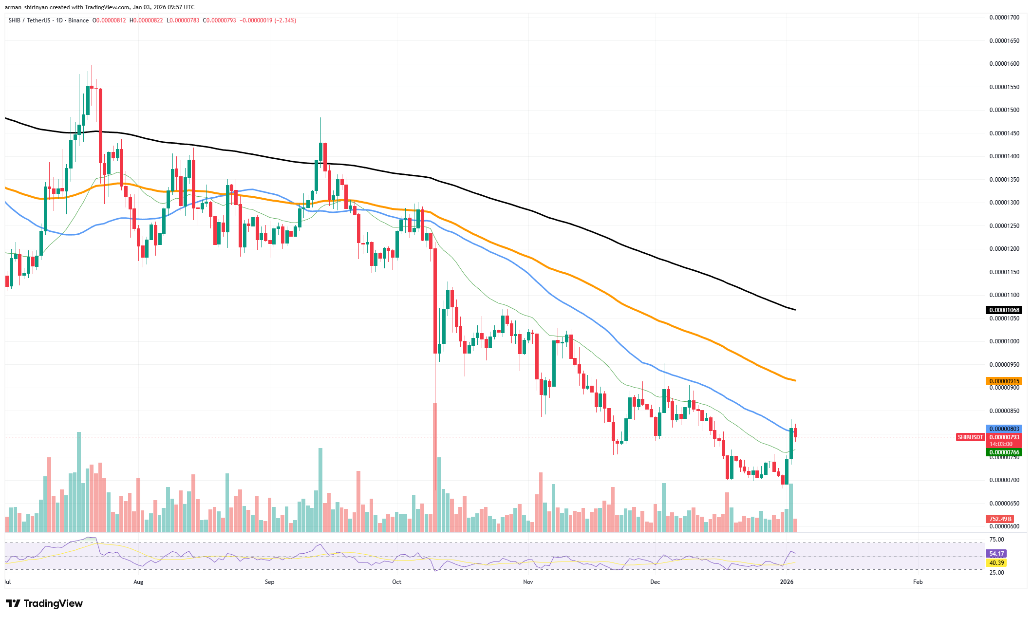 Shiba Inu市场并未显现爆发迹象,反而呈现出资金枯竭、行情压缩的状态,正处于能否重新回升的关键节点。这一现实清晰地反映在价格走势中:SHIB仍处于更广泛的下行趋势中,交易价格低于主要移动均线,每次反弹均遭遇抛压而难以持续。