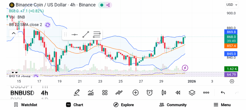 币安币如今位于最具扩展性的加密货币生态系统中心。该代币支撑着交易基础设施、去中心化应用、教育平台及钱包服务等多元产品。历史市场周期表明,在生态加速期BNB往往表现强劲。近期价格走势反映的是健康回调而非结构性疲软,此前币价在前期高点附近多次遇阻回落。