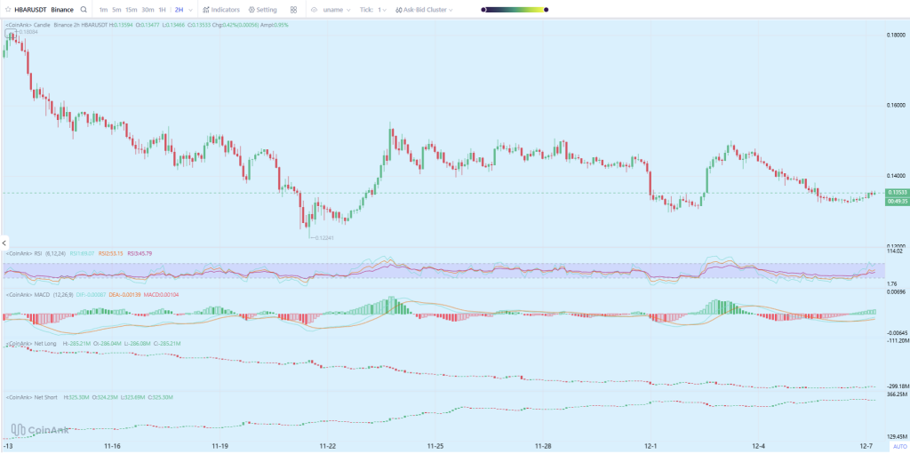 在RSI指标面板中,HBAR曾在11月低点附近进入超卖区域,随后反弹至中线略上方。快速RSI线目前徘徊在50-60区间,表明卖出动量已减弱,但也未出现强烈的超买信号。这种中性偏多的读数意味着空头力量有所消退,但多头尚未完全掌控局面。
