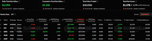根据SoSoValue截至1月22日的市场更新数据,XRP相关ETF市场数据显示单日总净流入为209万美元。XRP相关ETF的累计总净流入额为12.3亿美元。报告的总交易额为1805万美元,总净资产达13.7亿美元,占XRP市值的1.17%。