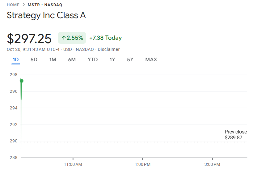正如预测所示,10月16日MSTR进一步跌至296.76美元。分析师认为其表现不佳源于比特币价格下跌导致投资者信心流失。但随着比特币显露复苏迹象,MSTR已重获动能。Google财经数据显示,MSTR现报297.25美元,24小时涨幅2.12%。
