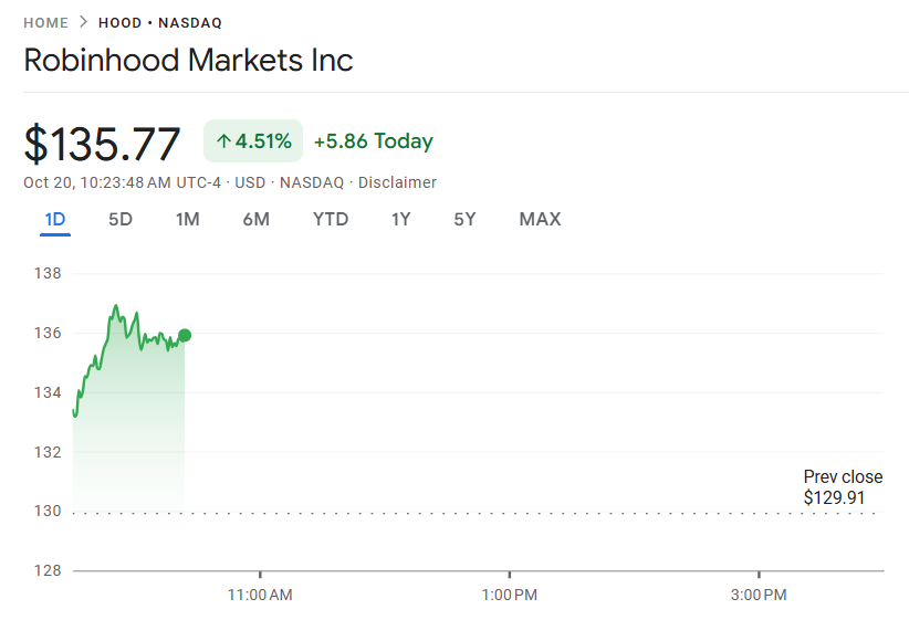 Robinhood(HOOD)当前股价报135.77美元,日内涨幅4.51%。