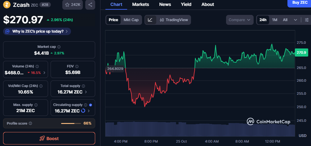 过去24小时内,Zcash呈现强劲上涨趋势,价格攀升2.96%至270.97美元。该加密货币在早盘跌破255美元后重获动能,图表上持续的绿色走势线显示出市场信心恢复与稳健的上行动力。