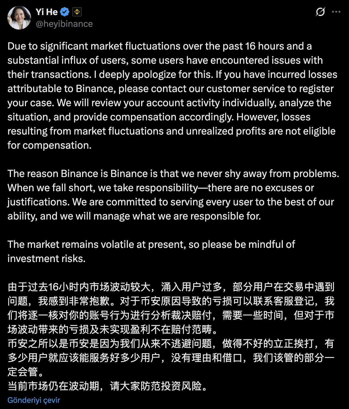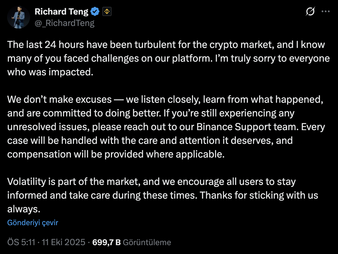 币安披露,土耳其时间10月11日00:36至01:16期间使用USDe、BNSOL和WBETH作为抵押品,并在期货、保证金和借贷产品中蒙受损失的用户将获得补偿。公告承认平台在高波动期间出现性能下降,导致订单处理和延迟问题引发部分损失。何一呼吁用户如遭遇可归因于平台的问题及时联系客服,承诺将逐案审核索赔,但明确指出未实现收益和正常价格波动损失不予赔付。