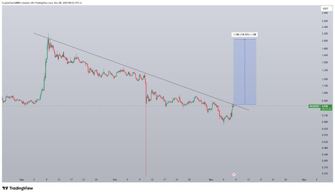Crypto Charts(@Cryptokartha)分享的图表显示,Worldcoin(WLD/USDT)在长期熊市后正在测试一条长期下降趋势线。这一结构暗示潜在反转可能,该代币正试图突破自9月下旬以来形成的阻力位。若突破确认,将是数周窄幅震荡后的首次重大趋势转变。