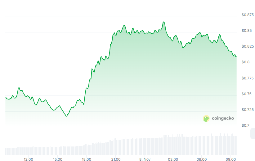 截至撰稿时,Worldcoin的表现支持技术面突破的叙事。过去24小时内,WLD价格从0.746美元攀升至0.810美元,涨幅8.71%。伴随这一改善的是3.41亿美元的24小时交易量,较前日激增118%。