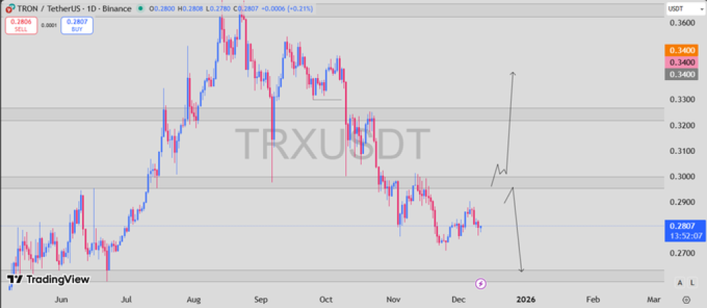 分析师RISK指出当前市场结构正在"为决定性突破蓄势"。其分享的图表显示TRX正被压缩在重要支撑区与0.30美元阻力位之间。虽然代币尝试构筑底部,但至今未能重拾上涨动能。这种狭窄的整理形态往往只需一次强力推动就能扭转整体趋势。