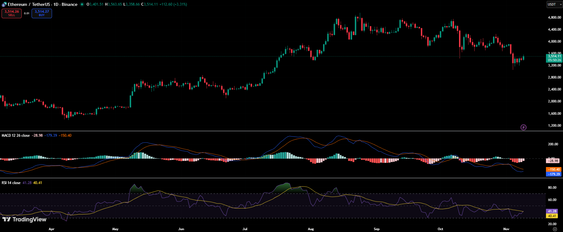 fliquida与此同时,相对强弱指数(RSI)从30附近的超卖区域回升至41,显示买盘动能改善。日线价格走势也表明ETH在3,300美元附近获得强劲支撑,该位置曾在夏季上涨行情中作为突破区。
