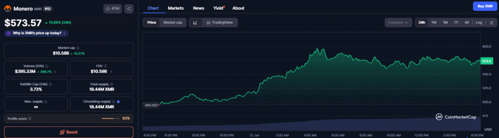 门罗币(XMR)价格触及596.87美元的历史新高。过去一周,该加密货币涨幅超过35%。截至撰稿时,其价格报573.57美元,虽略有回调,但仍稳固地位于历史高点之上。