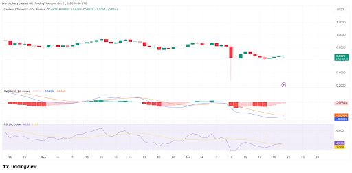 此外,Sheldon发布的短期图表显示ADA正接近下降趋势线。该趋势线自10月初以来一直存在。Sheldon指出:"ADA看起来很强劲,接近动能趋势线",指向价格行为开始挤压的区域。