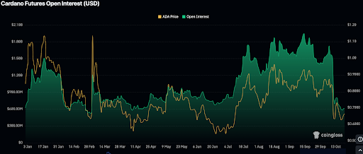 根据Coinglass数据,ADA期货未平仓合约额为6.4856亿美元,较9月中旬超过18亿美元的高点有所下降。这一下降伴随着价格下跌,ADA跌破0.70美元水平。