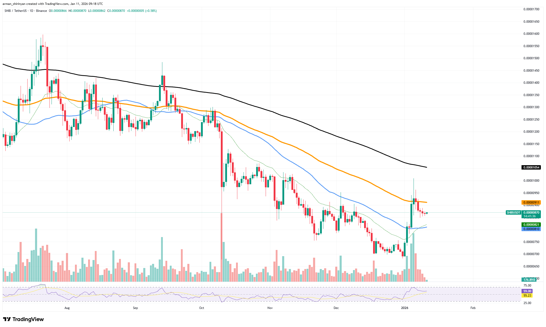 在下跌之后,SHIB正在小幅尝试稳定价格。该资产在由中长期EMA定义的较重阻力区下方挣扎,但它得以从局部低点反弹,并短暂收复短期移动平均线。