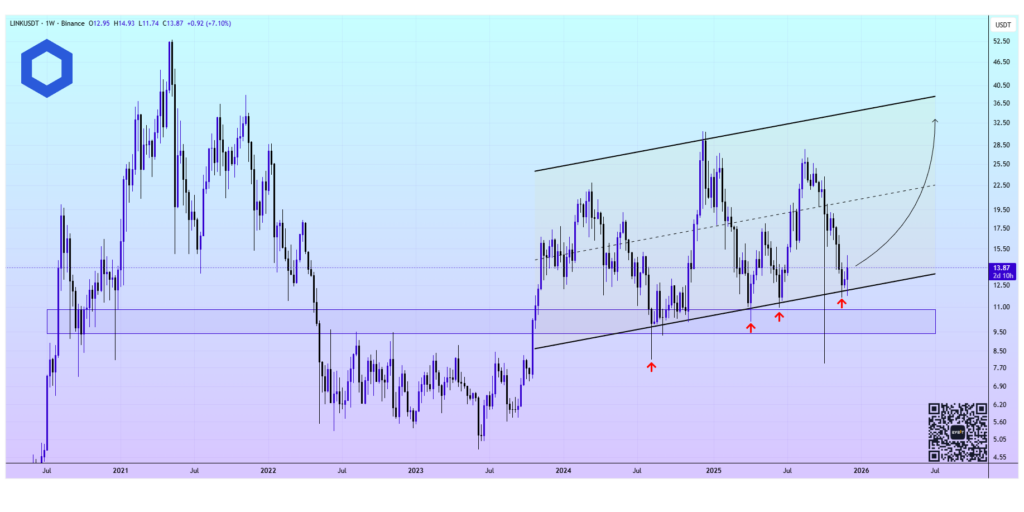 正如CryptClay所指,LINK正在关键区域上方的明确再积累区间内交易。图表显示价格触及上升通道下轨,该水平自2023年初以来一直引导趋势。每次LINK触及该线,市场均出现健康反弹。