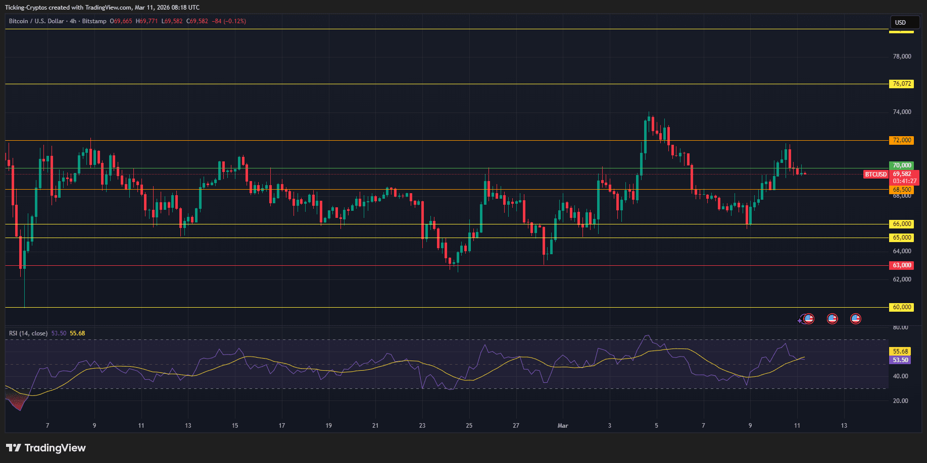 从技术图表观察,比特币自二月以来已形成清晰的矩形整理形态,为短期交易提供明确框架。