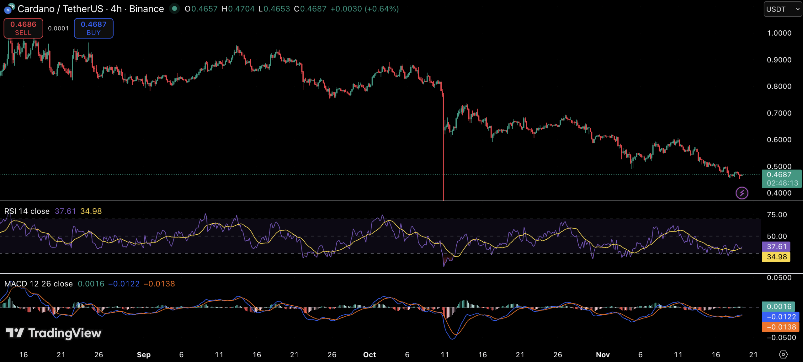 当流动性问题占据主导时,分析师发现ADA图表释放积极信号。加密货币分析师阿里指出日线RSI出现看涨背离,叠加TD序列买入信号,断言"反弹将至"。4小时图显示ADA处于RSI超卖区间,MACD等动量指标开始走平。