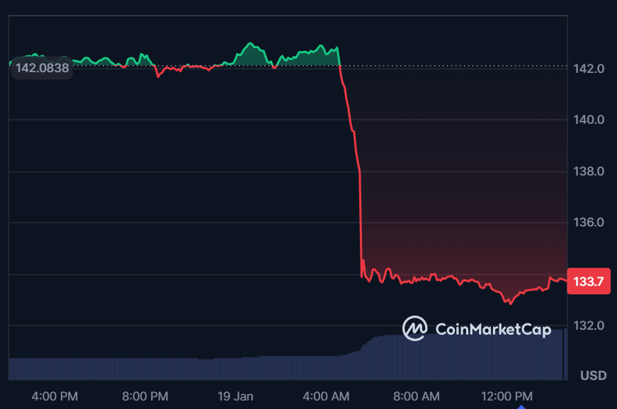 早间SOL曾触及143.06美元高位,但突如其来的卖压迅速将价格打压至132.82美元低点。当前SOL交易价格约133.73美元,单日交易量激增126%至51亿美元,过去24小时全网爆仓金额达6089万美元。