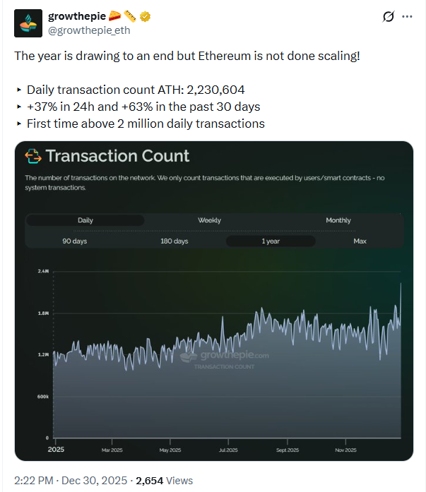 本周以太坊单日交易量达到新的历史峰值,创下重要网络记录。链上分析师分享的数据显示,单日处理交易量超过223万笔,这是以太坊自上线以来首次突破200万日交易量关口。此次飙升发生在年末,经过数月稳定增长后,24小时内链上活动增长37%,过去30天累计增长63%。这一增长反映的是网络使用率的提升,而非短期拥堵。