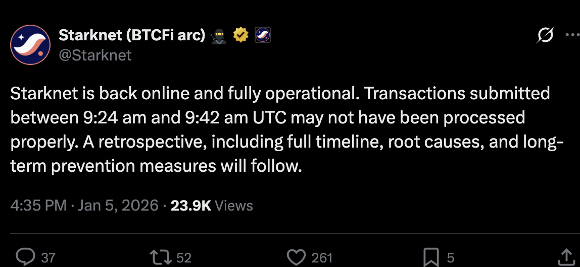 Starknet主网于2026年1月5日出现停机,区块生成缓慢导致整个生态的交易冻结超过两小时,众多去中心化应用与钱包服务受到影响。Starknet官方在X平台发布消息确认:“Starknet当前正经历服务中断。我们的团队正在积极调查问题,并全力争取尽快恢复全部功能。”