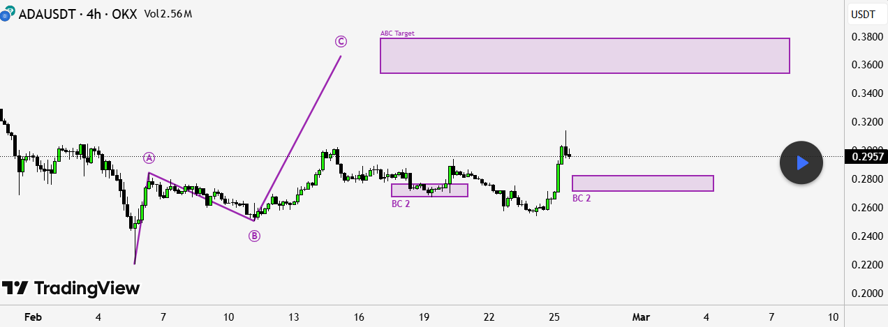 图表分析师在ADA/USDT四小时图上发现了看涨的ABC修正浪形态。其中A浪于2月初从0.22美元上行至0.28美元,B浪在2月11日回调至0.25美元。