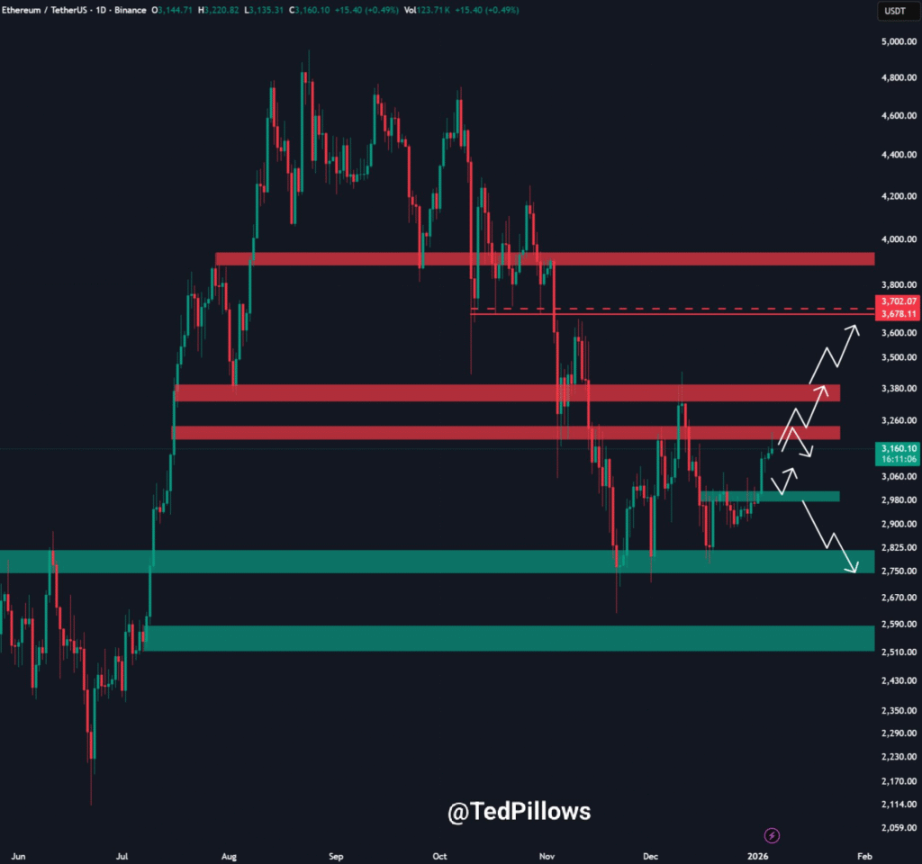根据TedPillows的分析,以太坊在3200-3400美元阻力区间附近的价格走势可能引发显著的价格波动。如果以太坊成功突破并持稳于该水平之上,其价格可能向3800-4000美元区域飙升。