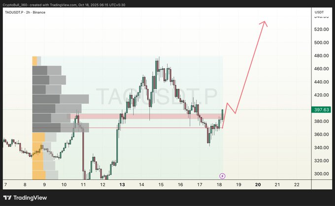 价格结构同时显示买方在360美元流动性区域积极防御,该价位多次出现长下影线表明强劲买盘。随着$TAO在该区间上方紧密整理,交易者预期突破410-420美元后将形成强势延续形态。