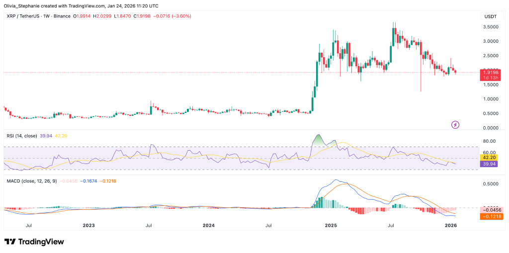 从周线图观察,XRP仍显露疲态。自2025年中以来持续形成更低的高点与低点,反映出更广泛的下跌趋势。近期在2.00美元上方的遇阻确认多头难以重掌主导权。
