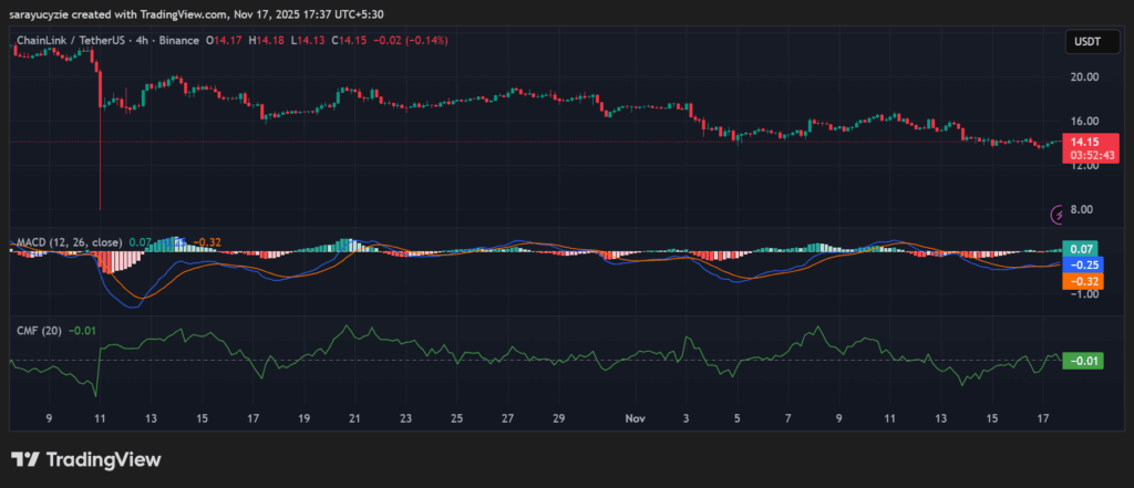移动平均收敛发散指标(MACD)和信号线均位于零线下方,表明当前看跌趋势仍占主导。虽然这只是短期疲软,但进一步下跌可能性较大。此外,LINK的佳庆资金流(CMF)指标为-0.01,显示市场抛压极小,几乎呈中性状态。负值表明资金流出大于流入,但尚未形成强烈下跌趋势。