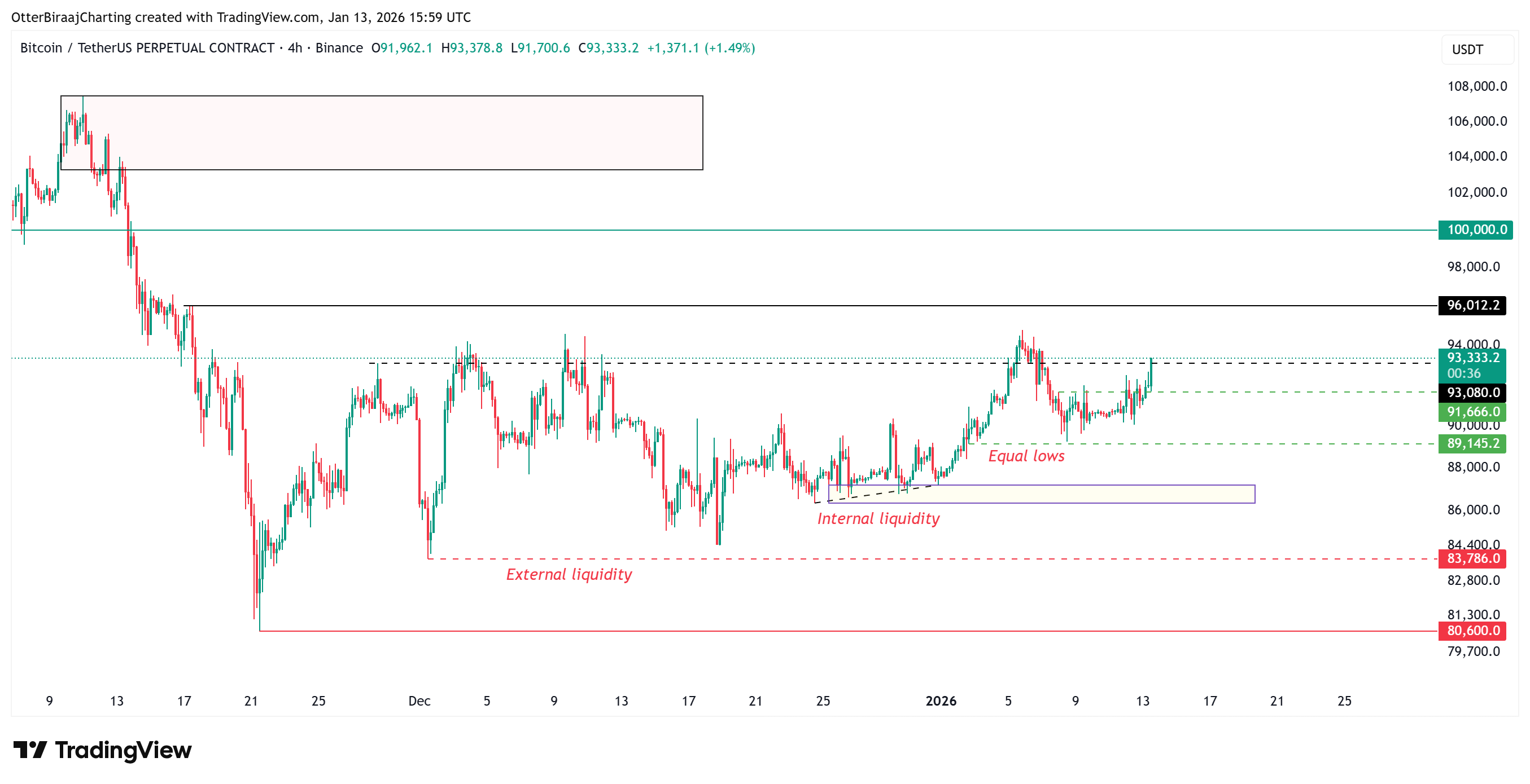 随着立法者推迟了备受期待的《CLARITY法案》审议进程,比特币(BTC)价格于1月13日触及93,500美元的周内新高。该法案旨在明确美国加密货币市场结构框架。