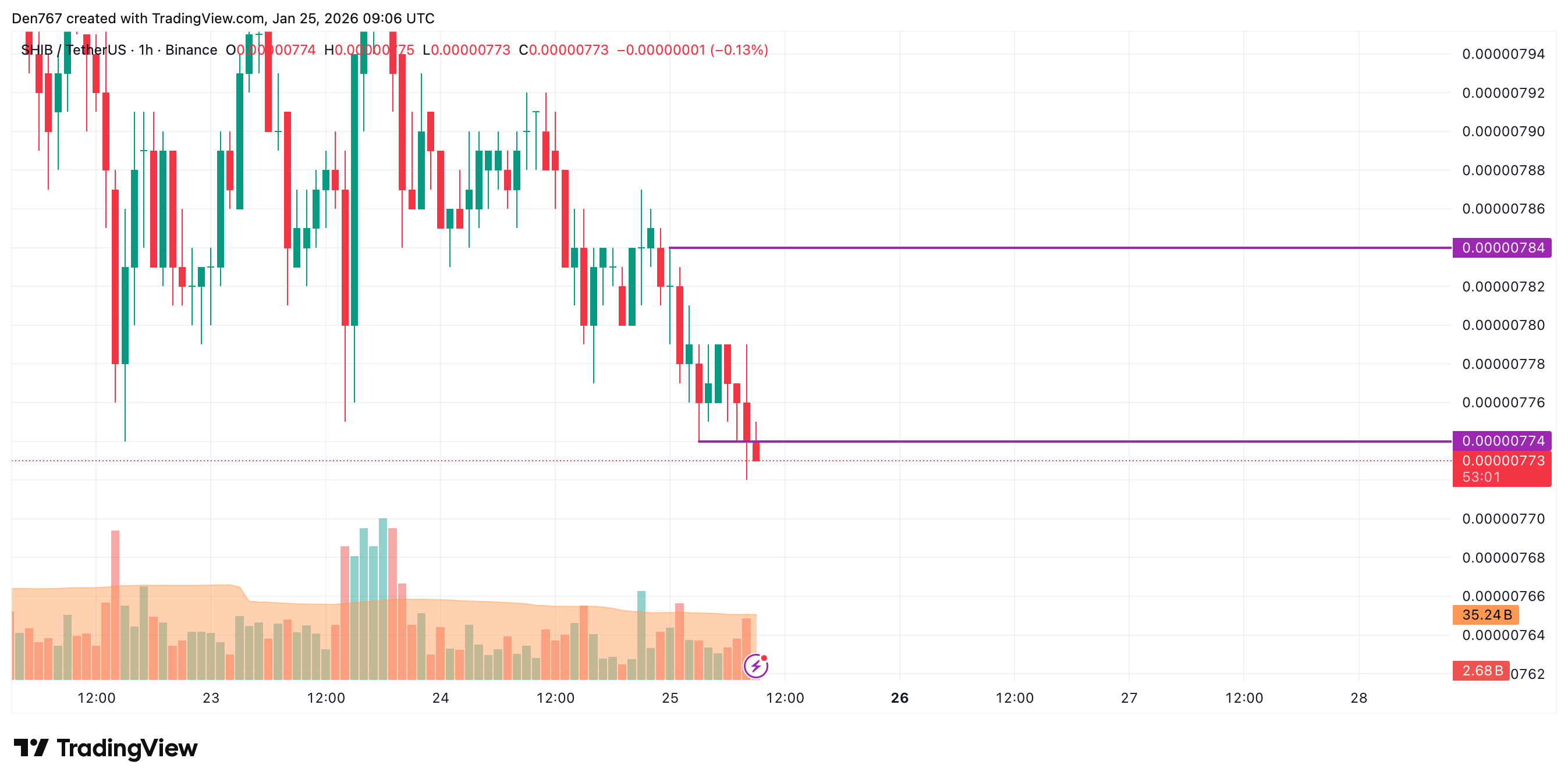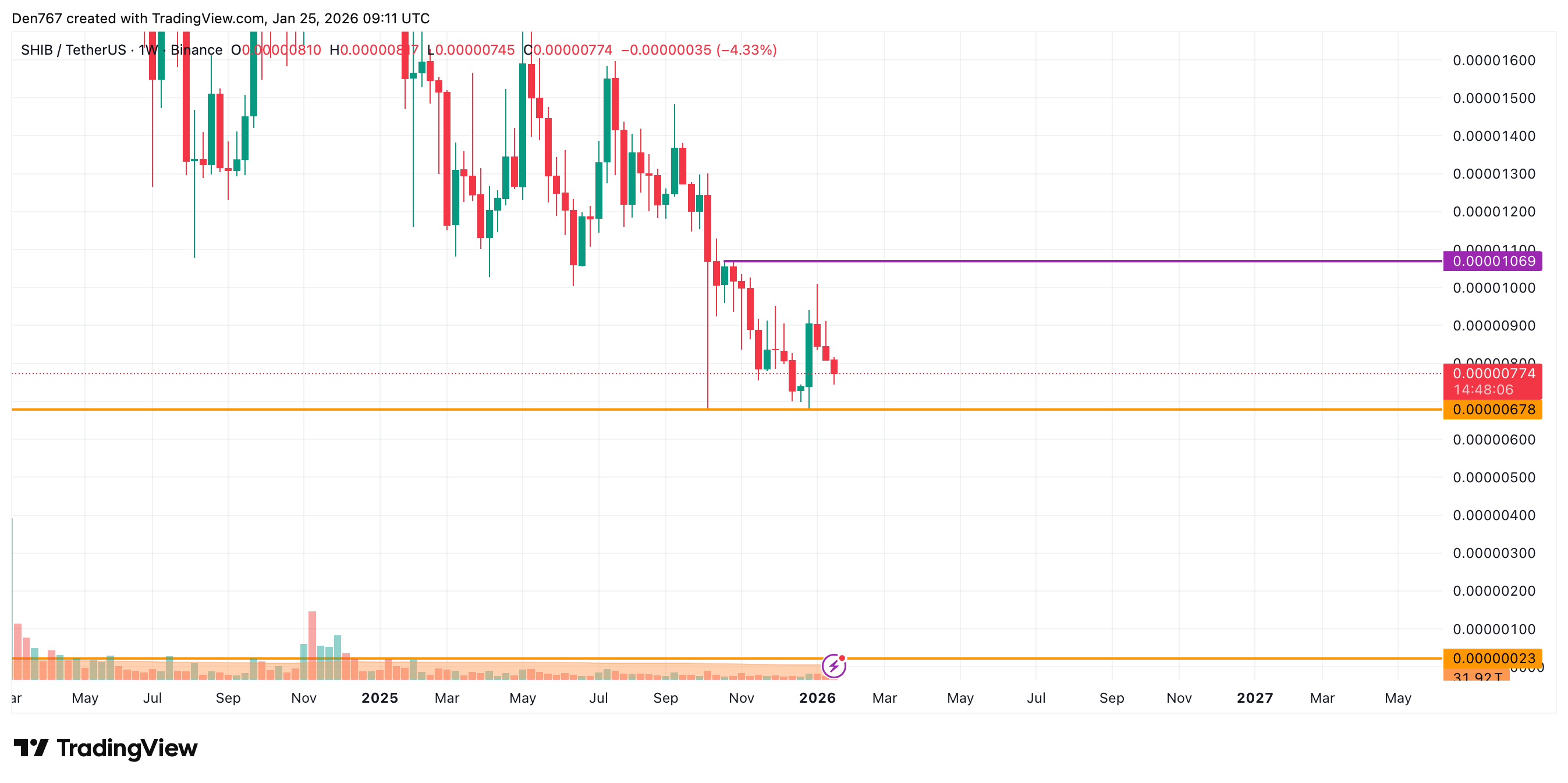从宏观时间框架观察,SHIB价格正在接近0.00000678美元关键支撑。若多头未能重掌主动权,交易者可能在下个月见证0.0000060-0.0000070美元区间的测试。截至发稿时,SHIB交易价格为0.00000774美元。