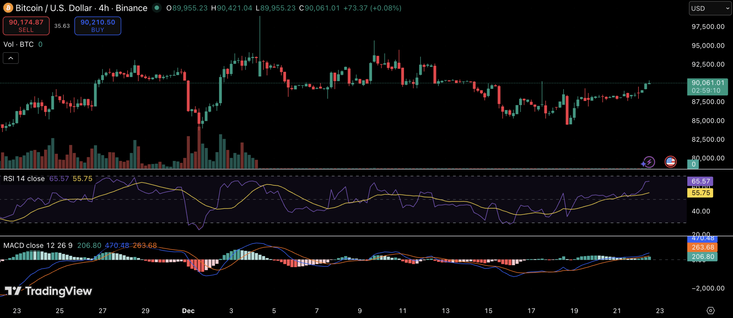 此公告发布之际,比特币在4小时图表中正于90,000美元区域维持相对窄幅震荡。动量指标显示看涨压力温和积聚,RSI持稳于中性区域上方,MACD呈上行趋势,预示短期情绪正在改善。