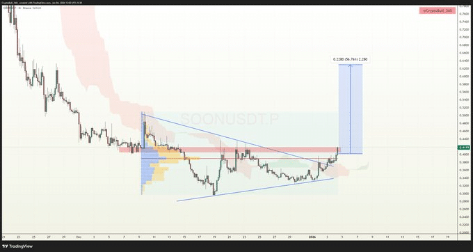 SOON在关键阻力区域附近交投,压缩信号显示卖压减轻,结构改善