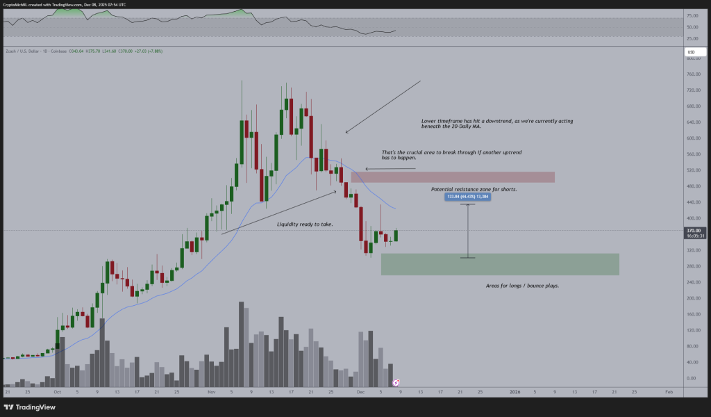 尽管反弹势头强劲,ZEC仍面临上方重大阻力。450美元至520美元的压力带正是上次反弹受阻的位置。日线图表同时显示ZEC价格仍处于20日移动均线下方,意味着短期趋势尚未完全逆转。