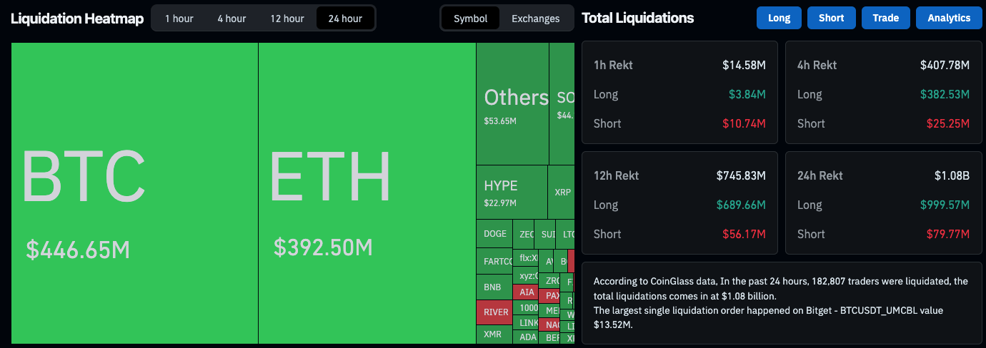 加密货币市场整体下跌4.65%,总市值缩水至2.98万亿美元。24小时爆仓金额高达10.79亿美元,其中比特币(4.47亿美元)和以太坊(3.93亿美元)占主导。