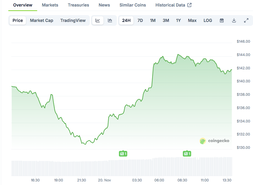 CoinGecko数据显示,Solana当前交易价格约142美元,过去24小时上涨1.82%,但周线仍下跌8.31%。同期交易量突破71亿美元。