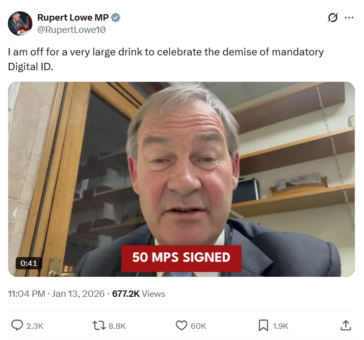 近三百万人签署了议会请愿书,反对数字身份证。洛在社交媒体X上发布视频庆祝政策转变,称他将“喝一大杯来庆祝强制数字身份证的消亡”。法拉奇则表示,这是“个人自由对抗可怕专制政府的一次胜利”。