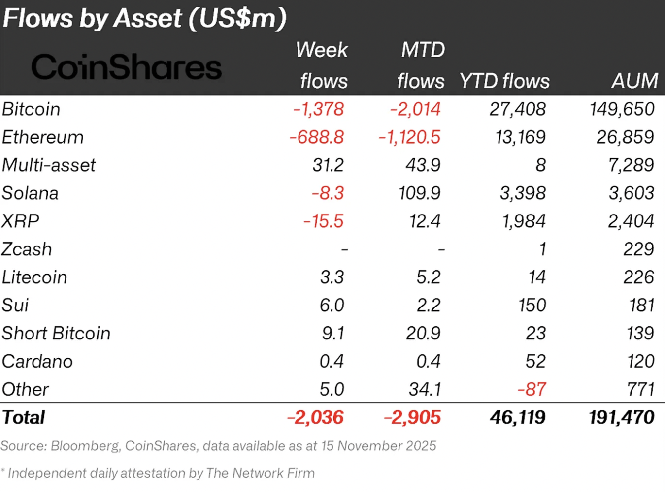 报告特别指出,加密货币投资产品的资产管理总规模(AuM)已从10月初的2640亿美元峰值降至1910亿美元,过去六周缩水27%。分析师认为这种下滑趋势源于美联储利率政策的不确定性,以及投资者的大规模抛售行为。