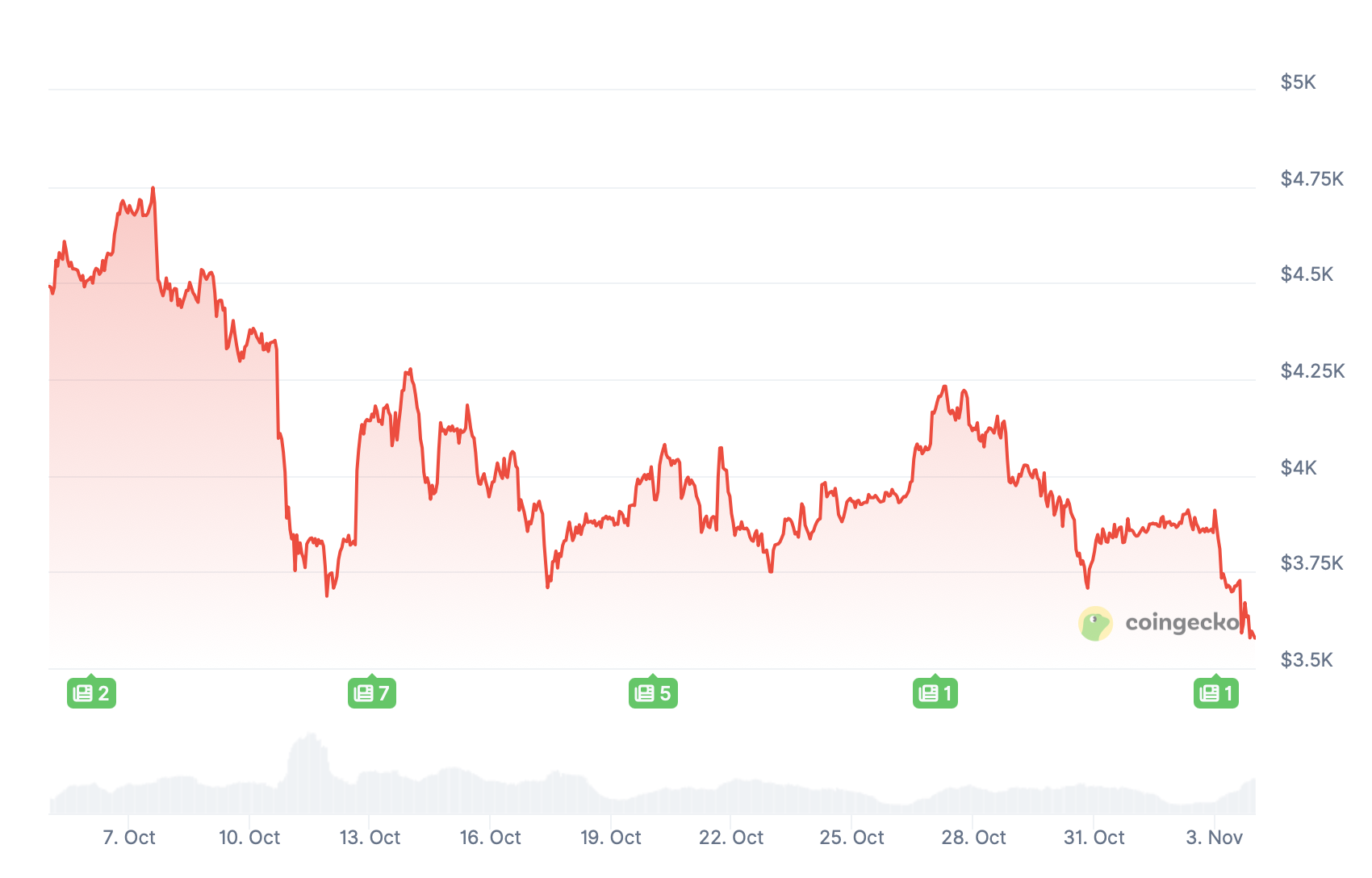 11月初ETH跌破3575美元,较10月高位回落20%。