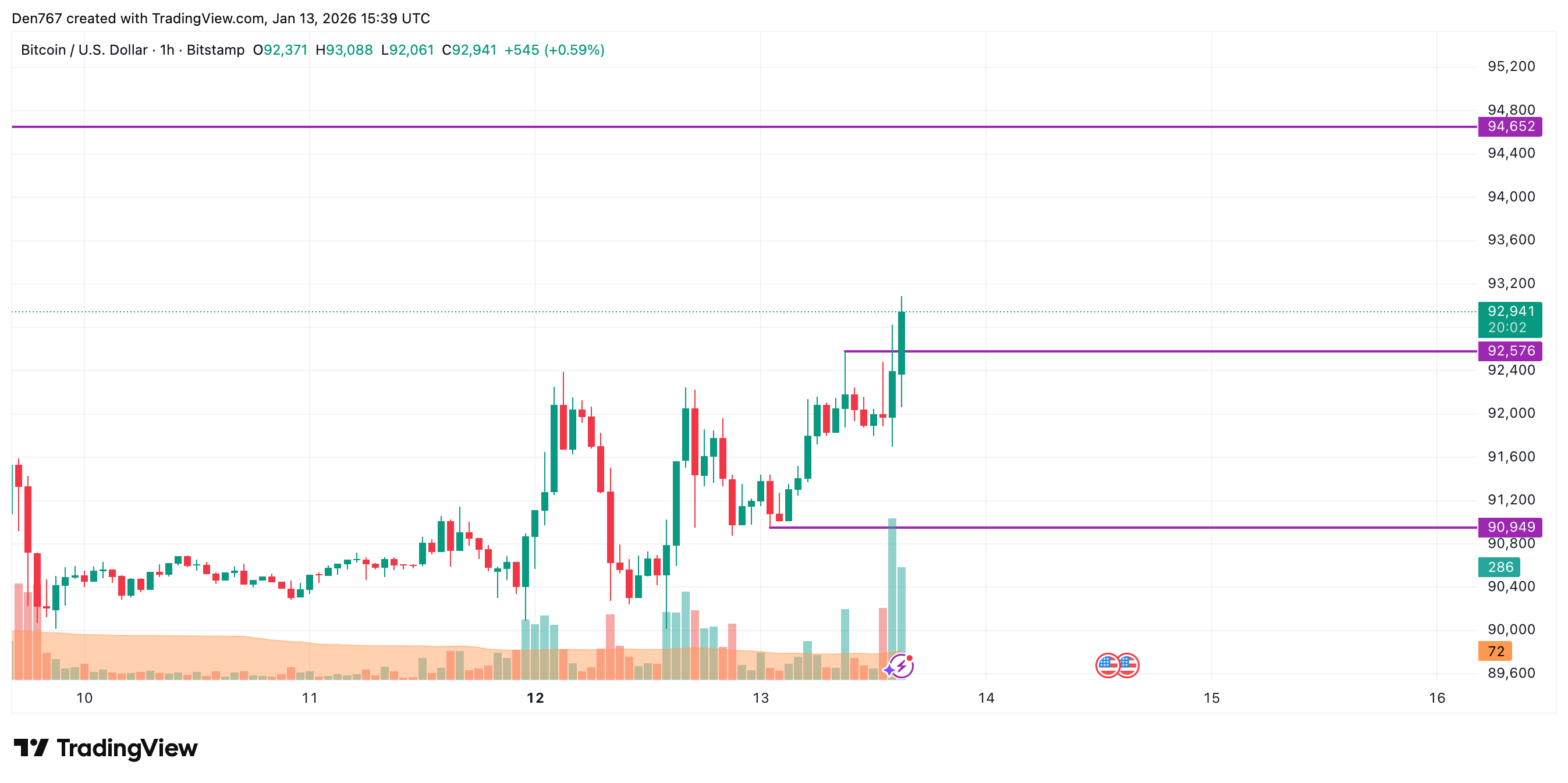 小时图显示,BTC价格已突破92,576美元局部阻力位。若多头能保持主动权并将价格维持在该水平之上,近期可能继续上探94,000美元区间。