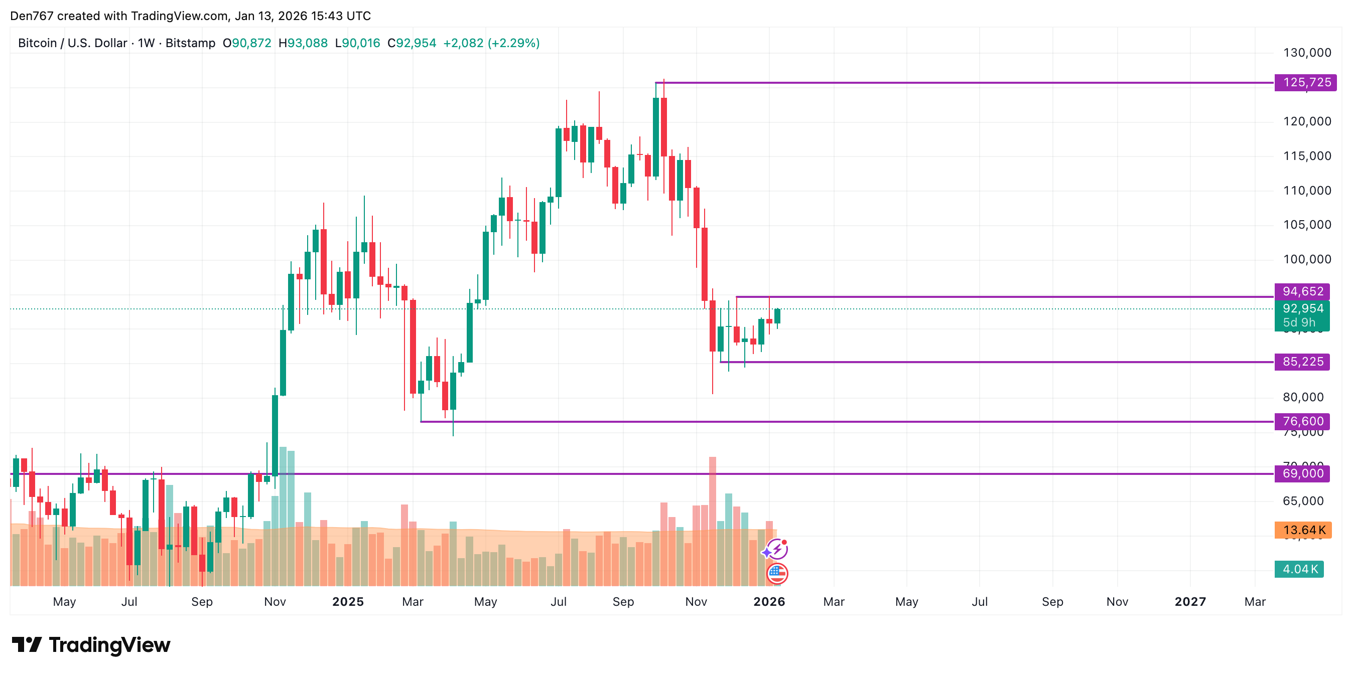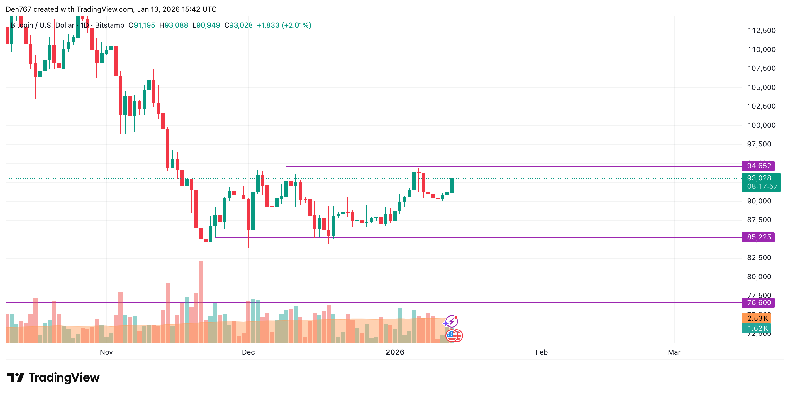 从更长时间框架观察,主要加密货币价格更接近阻力位而非支撑位。若突破94,652美元关口,积攒的动能或将推动价格测试100,000美元区间。
