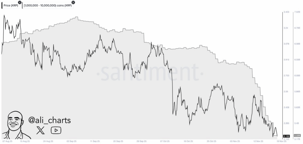 衍生品数据同样预示瑞波币可能进一步下跌。CoinGlass数据显示,XRP期货未平仓合约量较昨日下降近4%至40亿美元,表明交易者风险偏好减弱。分析师阿里·马丁内斯指出,过去两天内XRP鲸鱼已抛售1.9亿枚代币,这加剧了市场抛压。