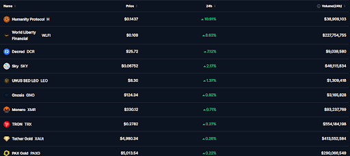 人性化协议以10.91%的涨幅领跑加密货币涨幅榜。LEO、GNO和XMR上涨,XAUT与TRX主导交易量。