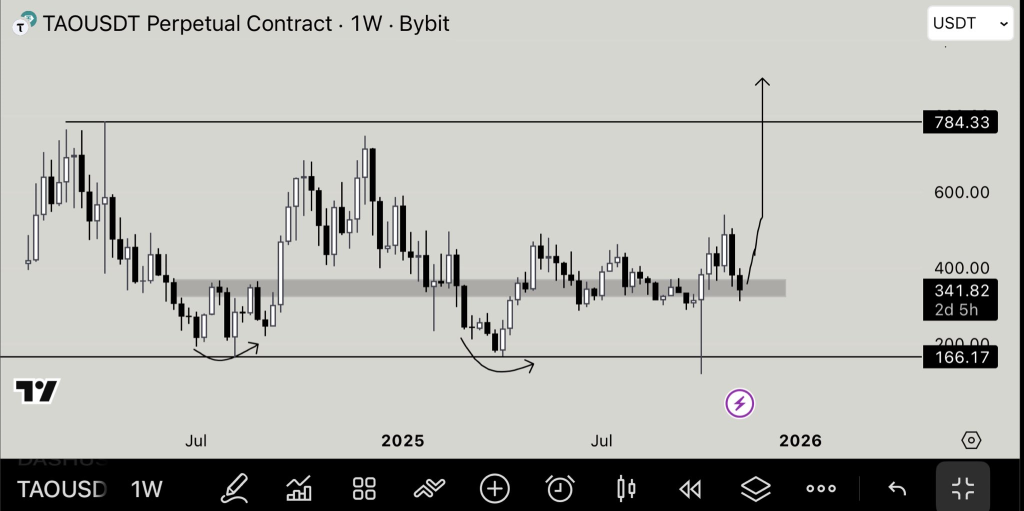 图表最关键的信号是位于784美元附近的宽广突破目标位,这代表区间顶部。技术上而言,突破该位置将确认多年反转结构的有效性。Nihilus用箭头标示了TAO突破该价格后的垂直爆发路径——这种结构常见于低供应资产长期盘整后的行情。