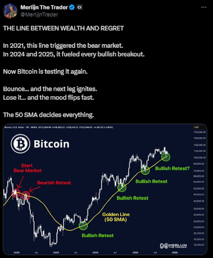 周一比特币价格徘徊在关键技术指标附近,交易员密切关注其50日趋势均线能否坚守。该指标在过去市场周期中常成为持续上涨与深度回调的分水岭。