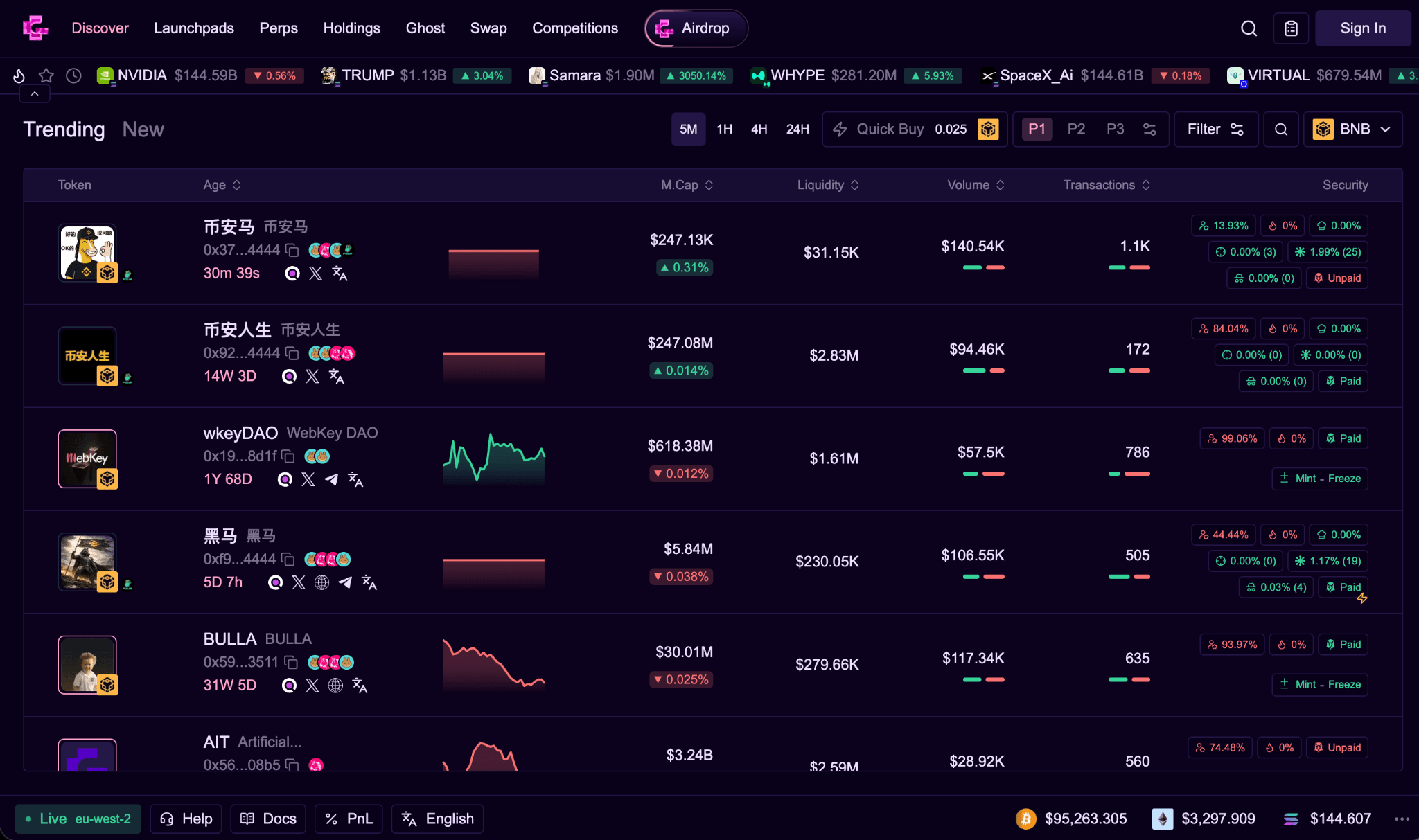 资产头部显示实时价格、交易量、市值、流动性和持有者数量。用户可以在此视图中直接调整时间间隔、切换网络并确认验证状态。