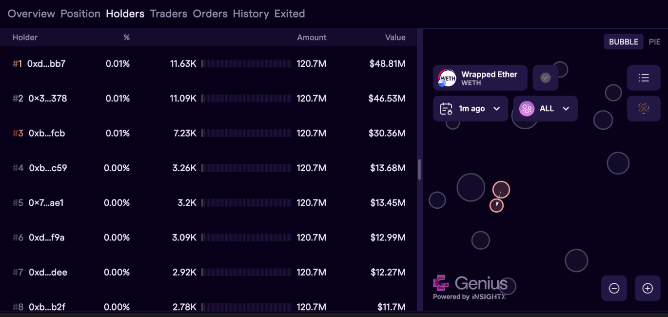 持有者面板列出了特定代币的最大钱包,显示所有权百分比、代币数量和美元价值。可视化图表突出了集中度风险和随时间的变化。