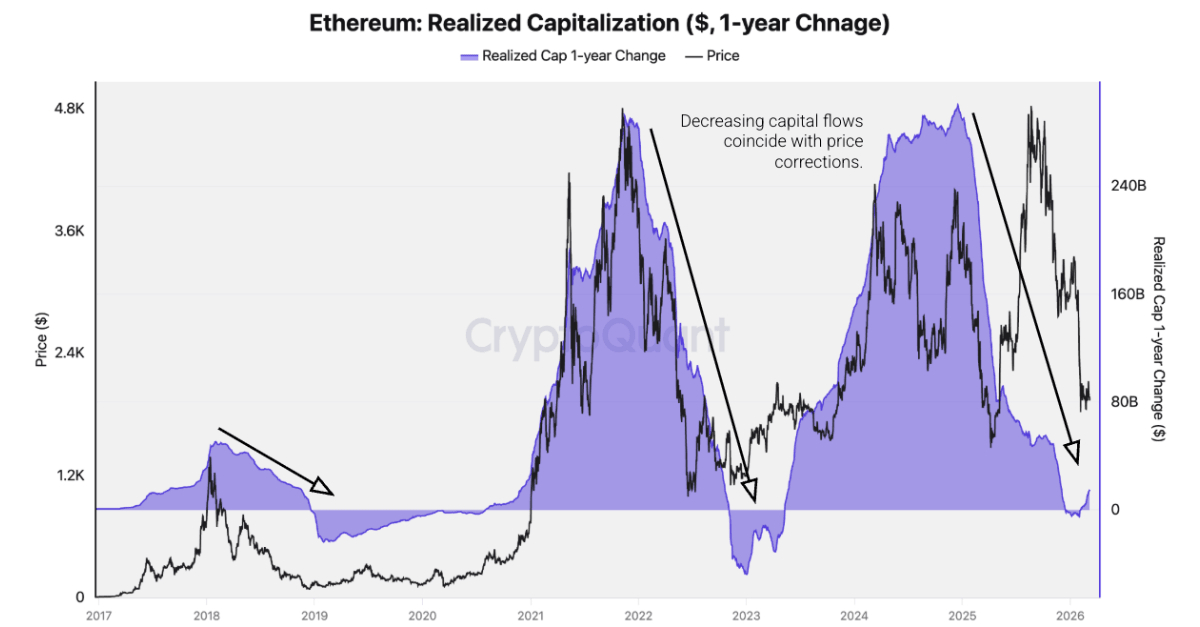 在2021年,上升的已实现市值与ETH最显著的价格上涨同时发生。当该指标在2022年转为负值时,估值急剧下降。历史似乎正在重演。