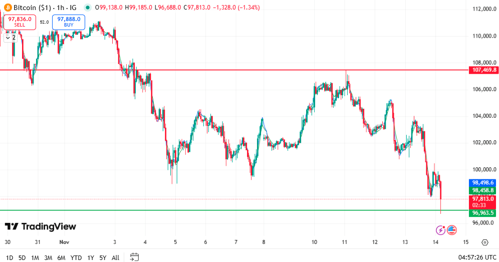 当前97,800美元附近聚集着5.81亿美元多头强平仓位,加剧深度回调风险。