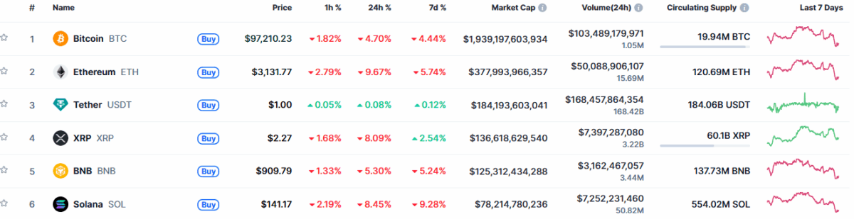 比特币颓势波及整个加密市场。过去24小时内,以太坊(ETH)下跌9.67%至3,131.77美元,Solana(SOL)跌8.45%至141.37美元。XRP在现货ETF推出后反而下跌8%至2.27美元。
